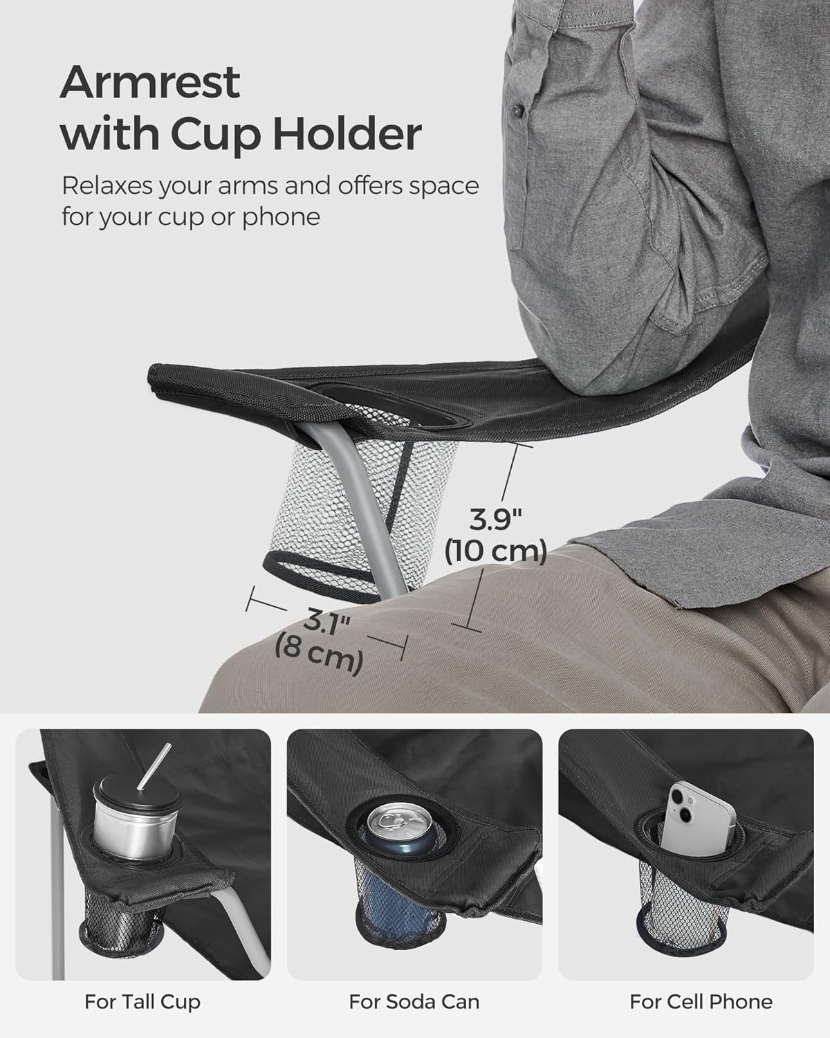 Constructed with a heavy-duty structure, each chair can support up to 330 lbs, ensuring durability and stability. The high backrest provides excellent support for your back, allowing you to sit back and unwind in style. The integrated cup holder lets you keep your favorite beverage within reach, so you can stay hydrated while enjoying the great outdoors.